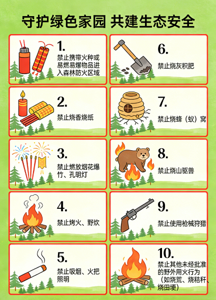 答:(1)禁止携带火种或易燃易爆物品进入森林防火区域;(2)禁止烧香烧纸、燃放烟花爆竹、燃放孔明灯、烤火、野炊、吸烟、火把照明、烧灰积肥、烧蜂(蚁)窝、烧山驱兽、使用枪械狩猎等其他用火(3)禁止其他未经批准的野外用火行为。