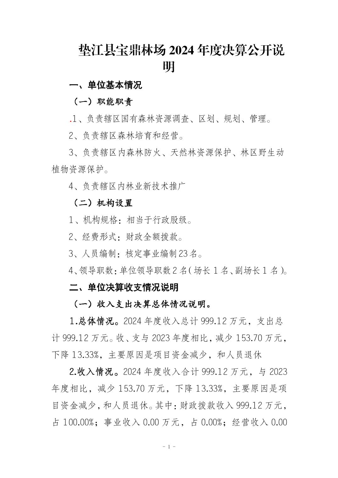 垫江县宝鼎林场2024年度决算公开说明