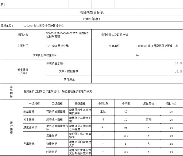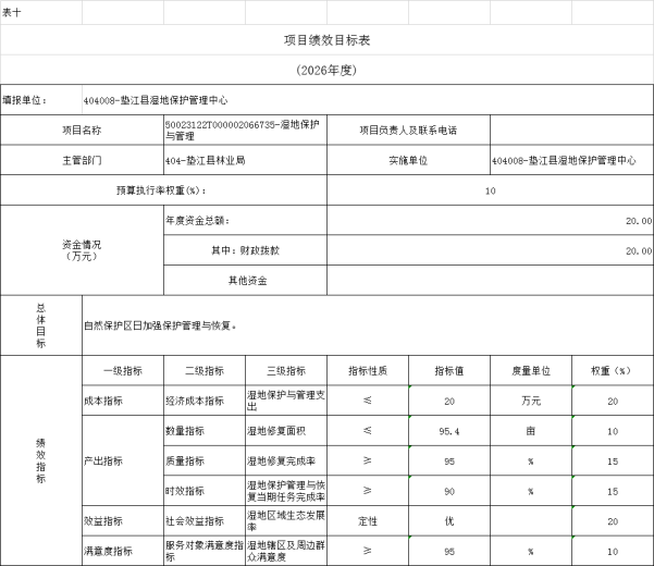 10.垫江县湿地保护管理中心2026年项目绩效目标表