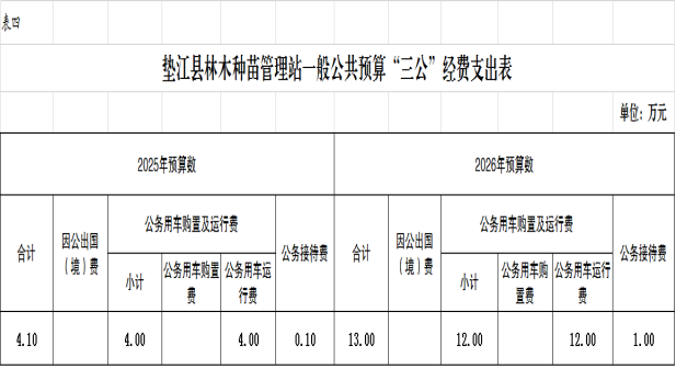 2026年“三公”经费预算 13.00 万元,比2025年增加 8.90 万元。其中:因公出国(境)费用 0.00 万元,与2025年保持一致;公务接待费 1.00 万元,比2025年增加 0.90 万元,主要原因是垫江县天然林保护工程管理中心合并至种苗站导致公务接待费用预算增加;公务用车运行维护费12.00万元,比2025年增加8.00万元,主要原因是垫江县天然林保护工程管理中心合并至种苗站,公务车辆变为3辆;公务用车购置费 0.00 万元,与2025年保持一致。
