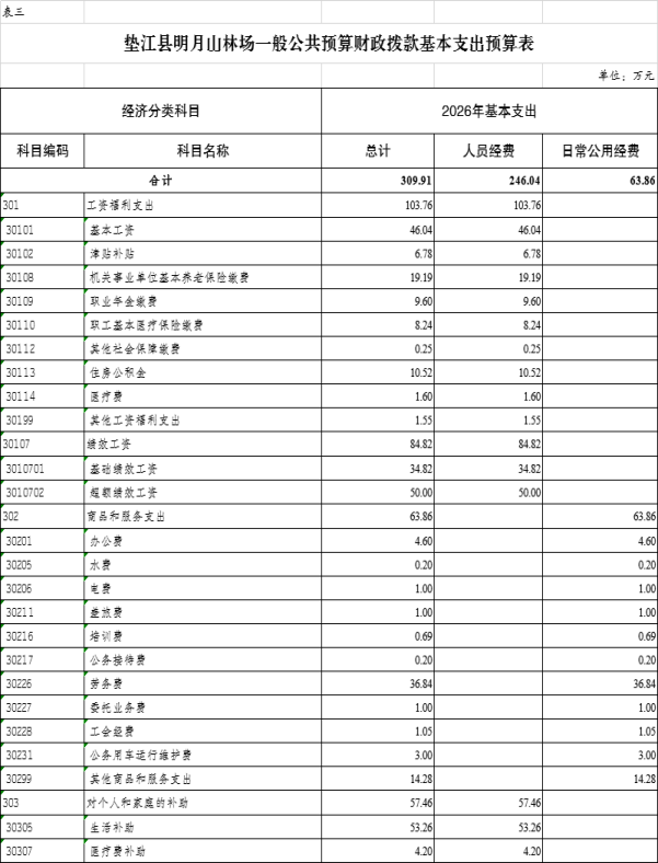 3.垫江县明月山林场一般公共预算财政拨款基本支出预算表