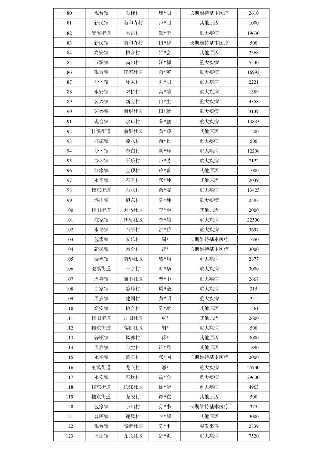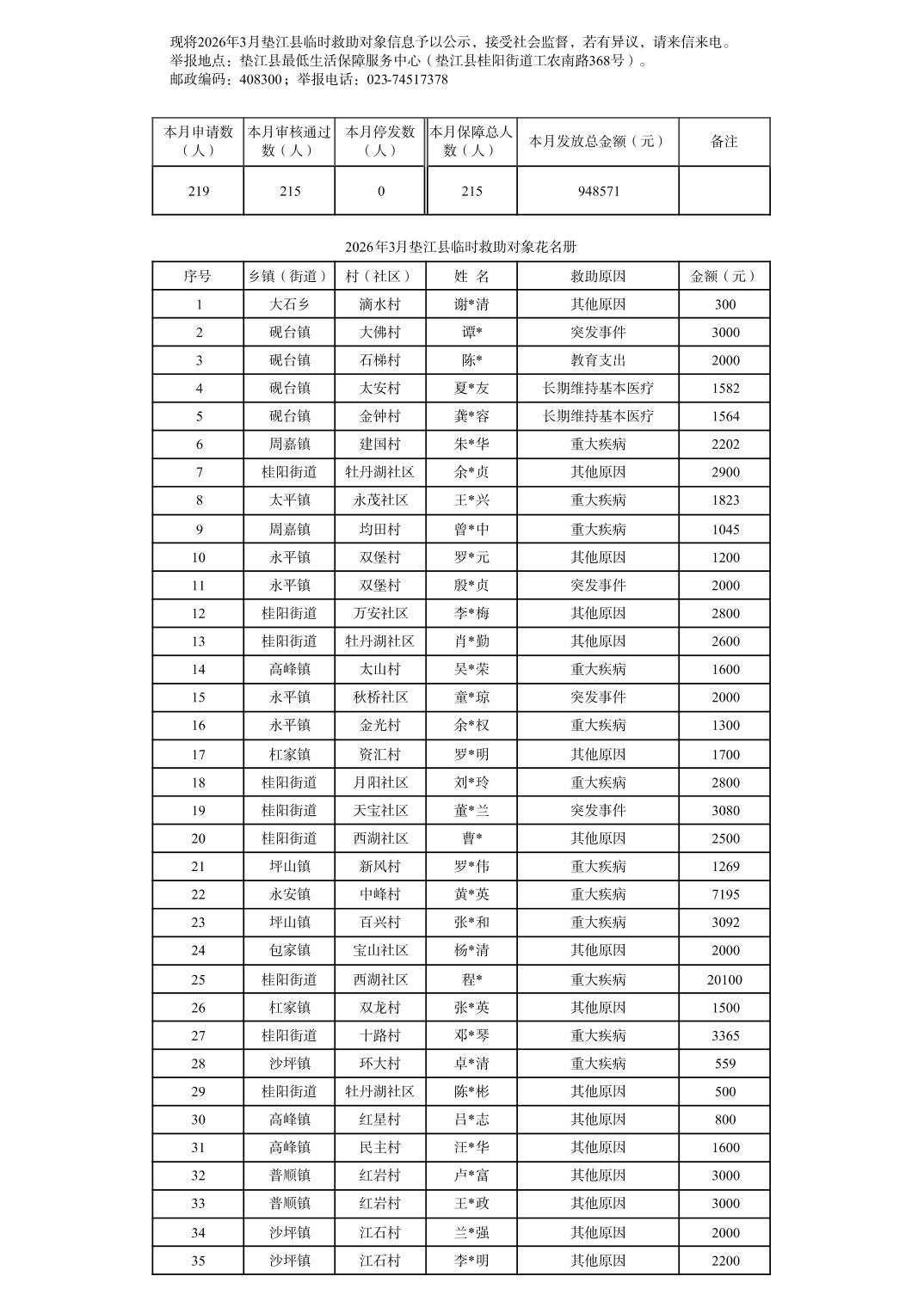 2026年3月垫江县临时救助对象信息公示
