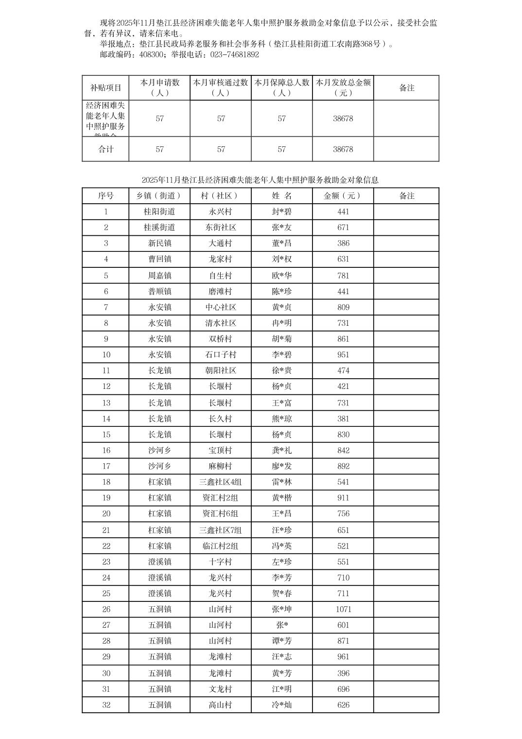 2025年11月垫江县经济困难失能老年人集中照护服务救助金对象信息