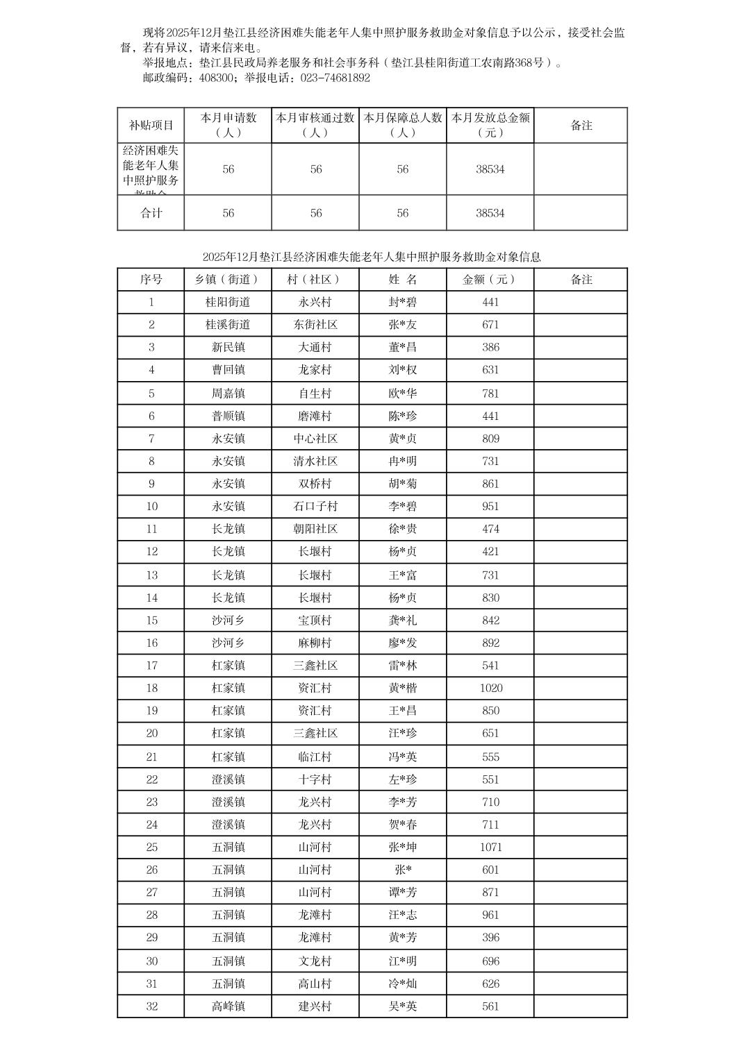 2025年12月垫江县经济困难失能老年人集中照护服务救助金对象信息