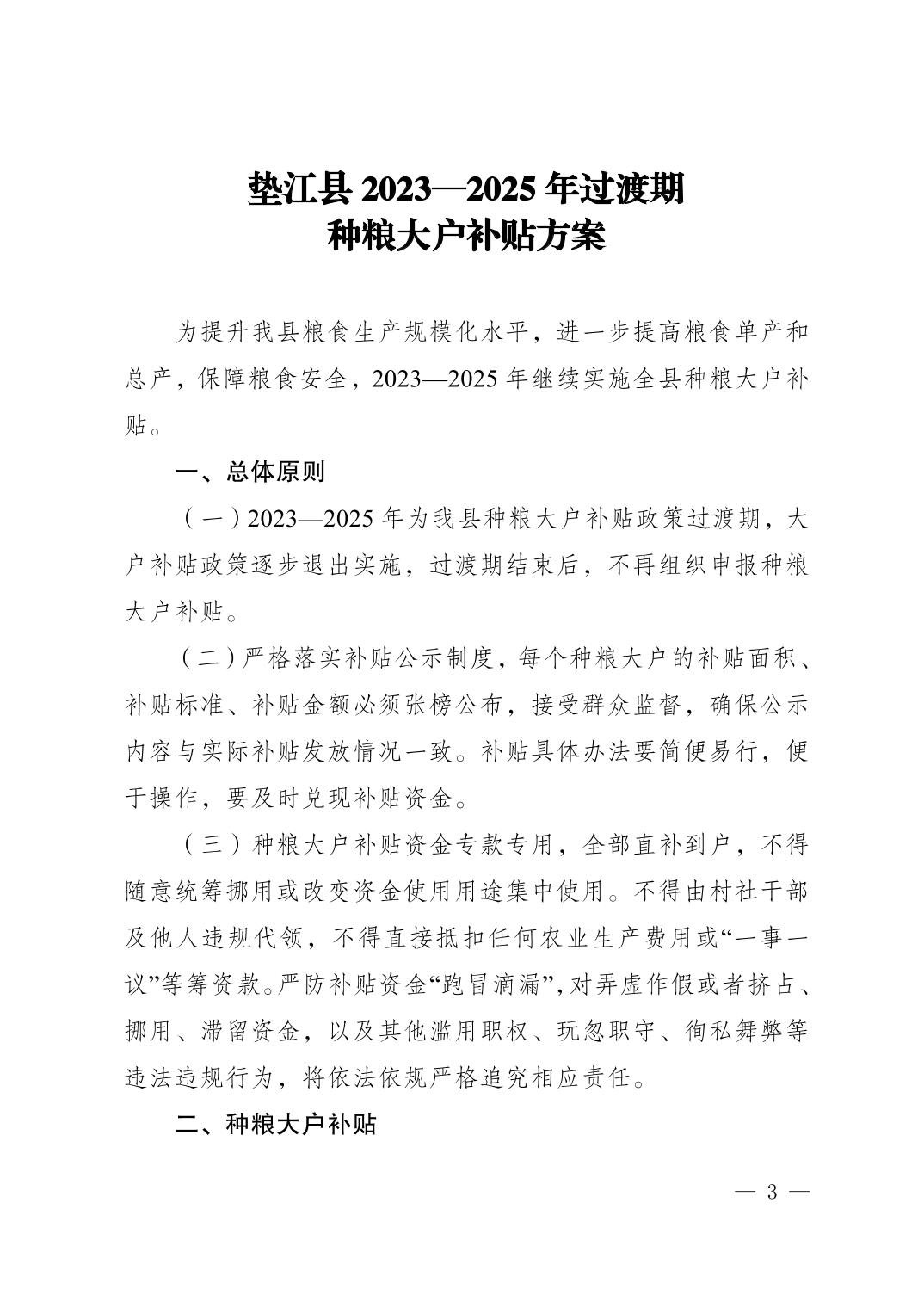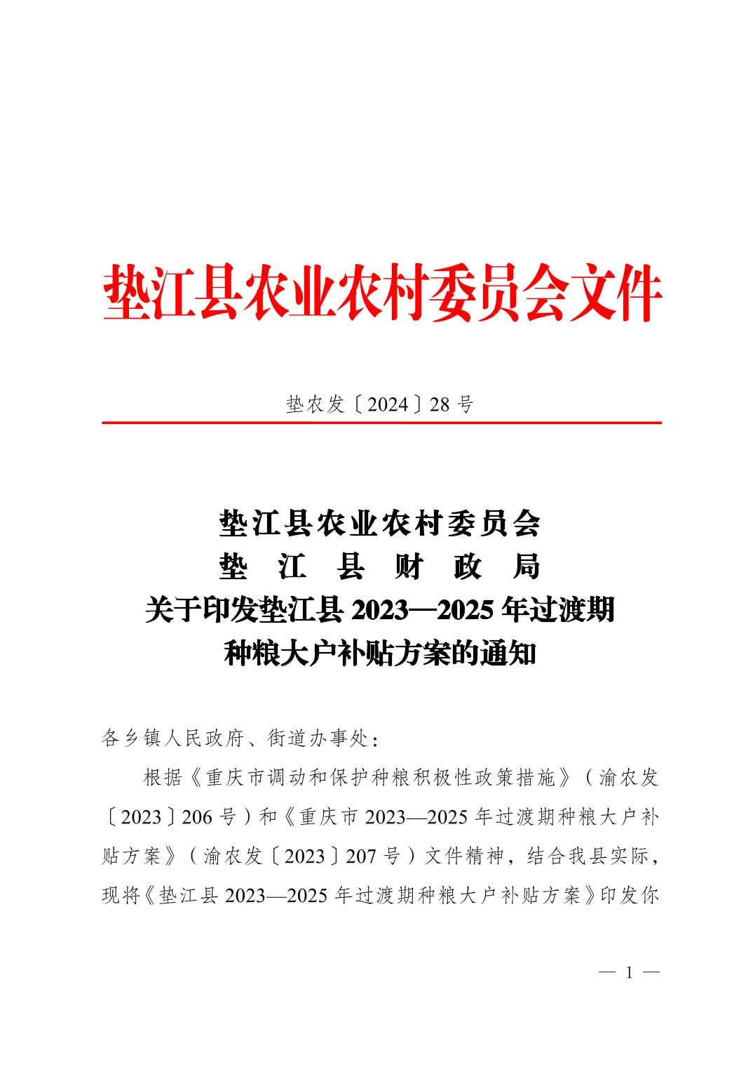 关于印发垫江县2023—2025年过渡期种粮大户补贴方案的通知