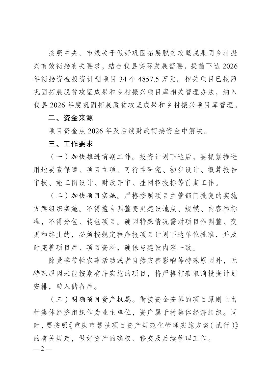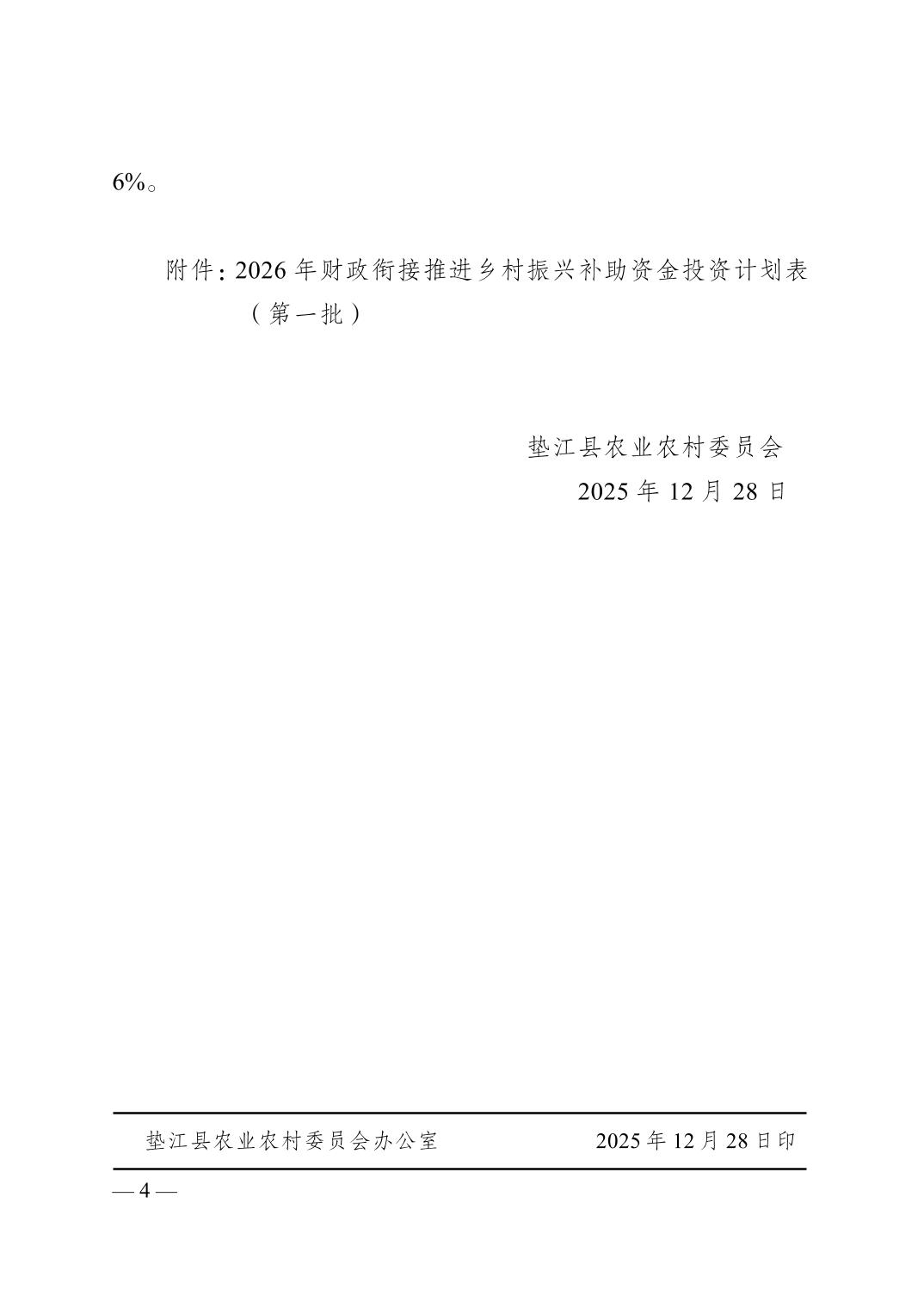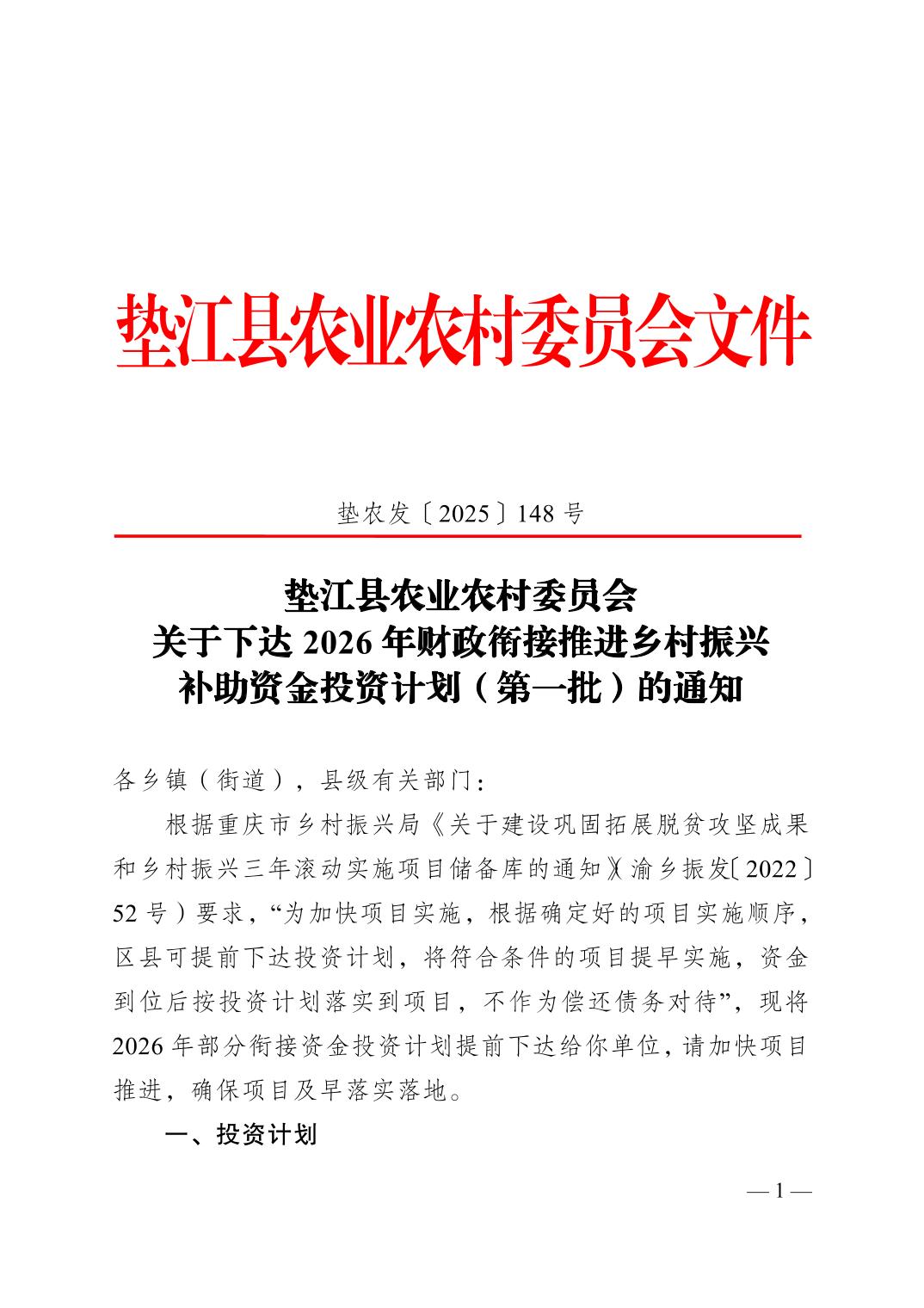 根据《关于加强财政衔接推进乡村振兴补助资金项目公告公示的通知》(渝委农办〔2021〕31号)要求,现将《关于下达2026年财政衔接推进乡村振兴补助资金投资计划(第一批)的通知》(垫农发〔2025〕148号)予以公示。