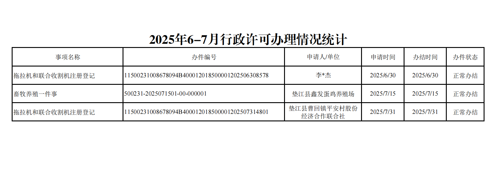 2025年6-7月行政许可办理情况统计