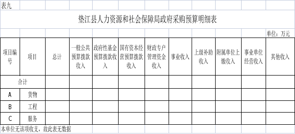 (二)政府采购情况。所属各预算单位政府采购预算总额0万元:政府采购货物预算0万元、政府采购工程预算0万元、政府采购服务预算0万元;其中一般公共预算拨款政府采购0万元:政府采购货物预算0万元、政府采购工程预算0万元、政府采购服务预算0万元。