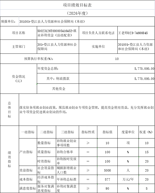 2026年一般公共预算财政拨款收入10635.49万元,一般公共预算财政拨款支出10635.49万元,比2025年增加増加1998.56万元。其中:基本支出2689万元,比2025年增加268.42万元,主要原因是商品服务定额增加及购买服务人员支出增加,主要用于保障在职人员工资福利及社会保险缴费、离休人员离休费、退休人员补助等,保障部门正常运转的各项商品服务支出;项目支出7799.11万元,比2025年增加增加1730.14万元,主要原因是就业资金增加,主要用于各项民生支出补助、维护社会稳定等重点工作。