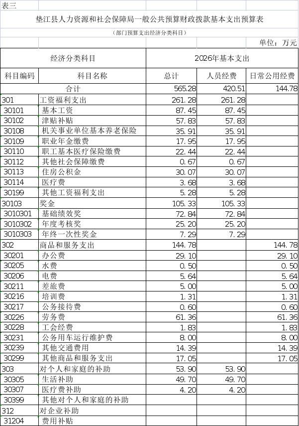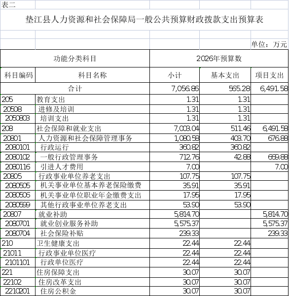垫江县人力资源和社会保障局(本级) 2026年单位预算情况说明