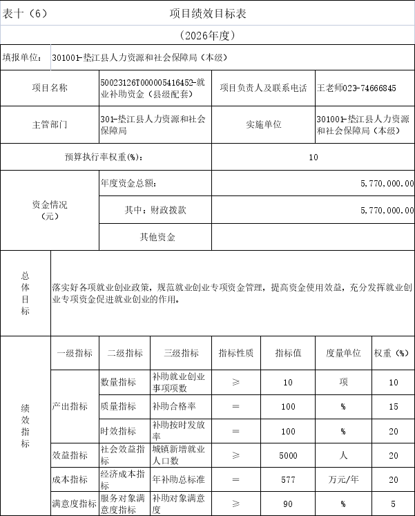 表十(10)项目绩效目标表 | |||||||