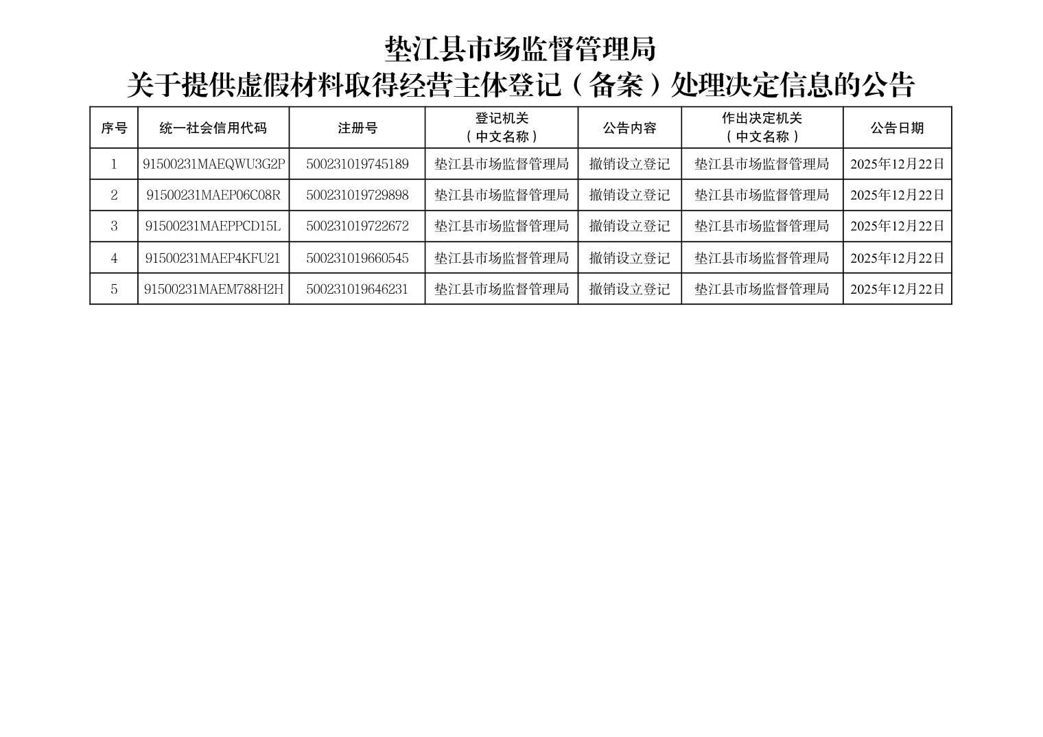 垫江县市场监督管理局关于提供虚假材料取得经营主体登记(备案)处理决定信息的公告(第三批)
