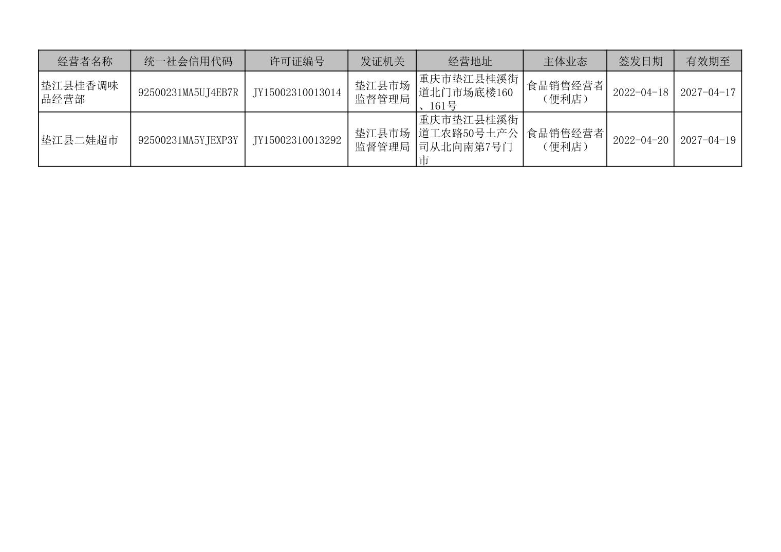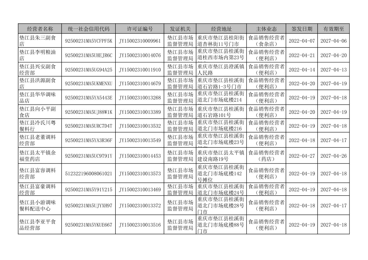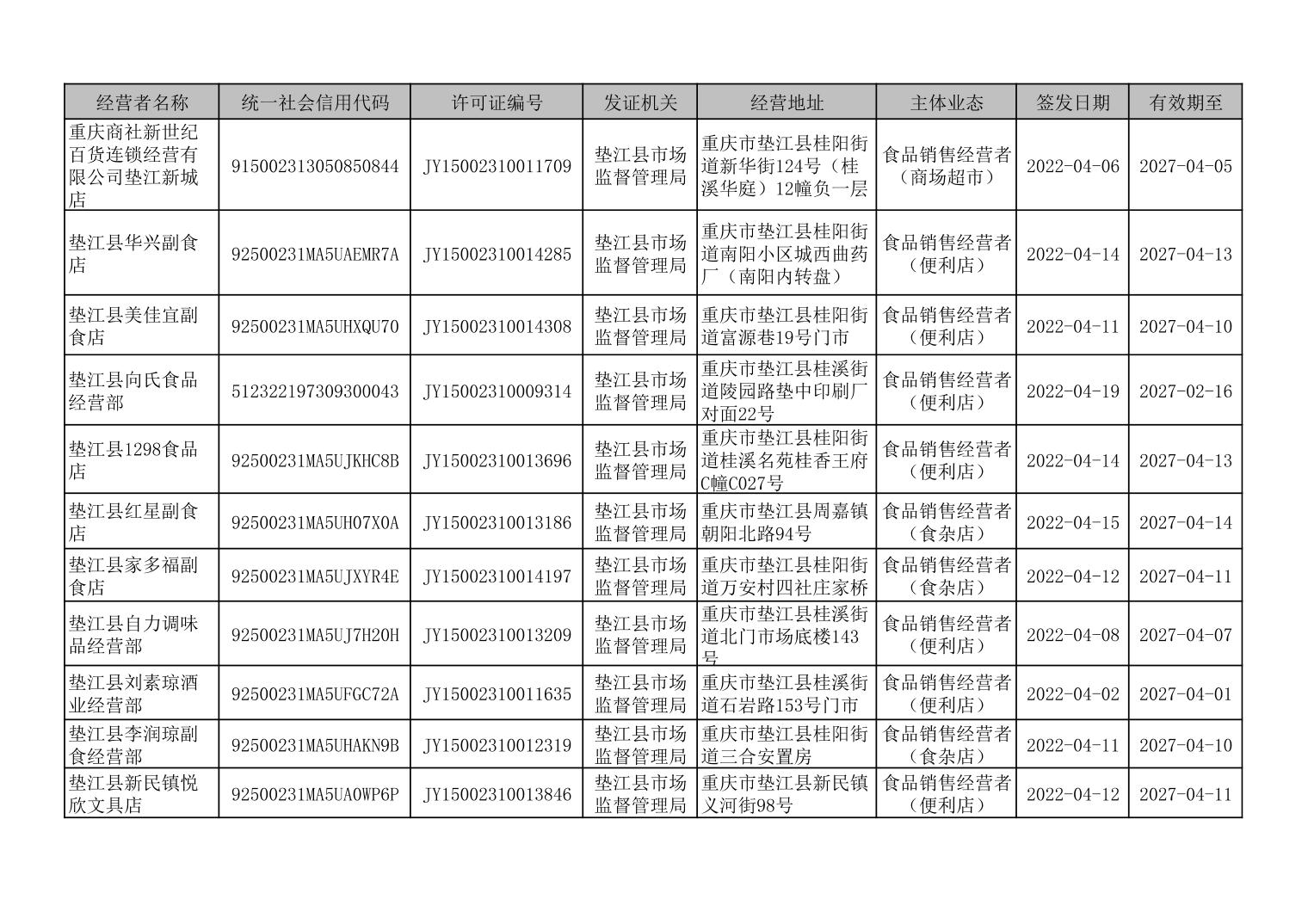垫江县食品经营许可延续情况信息台账(2022年4月)