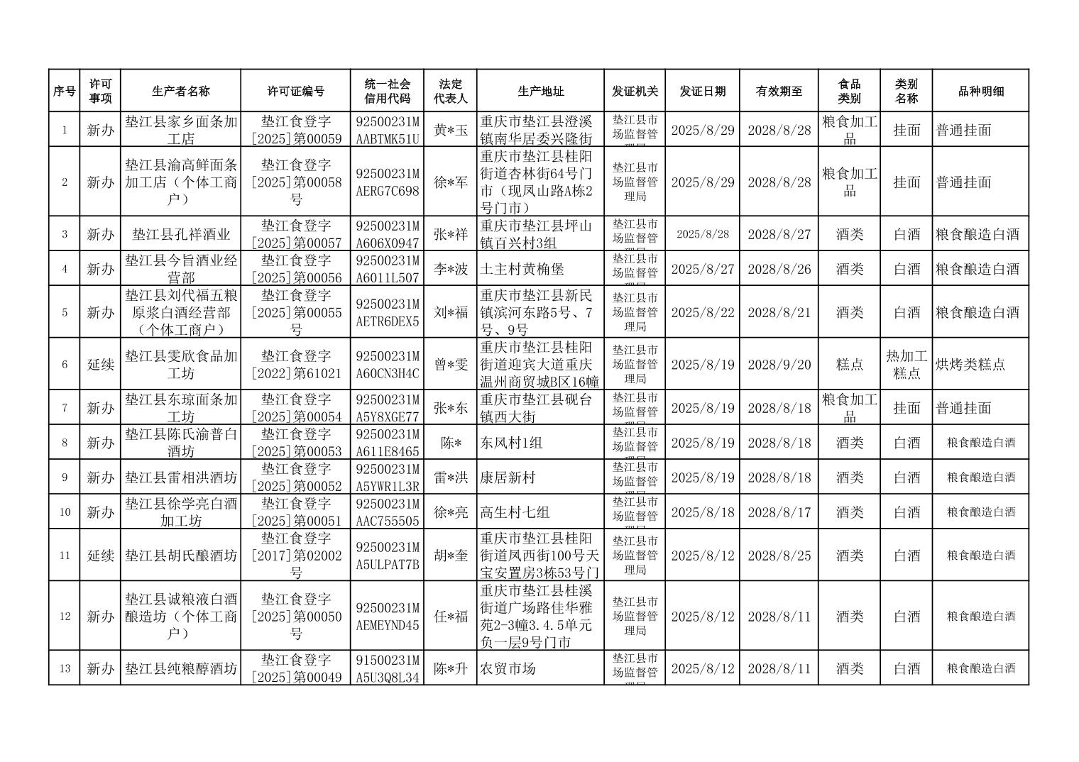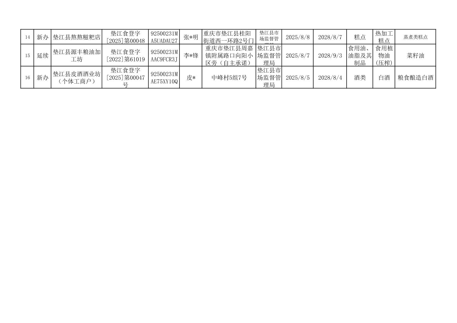 垫江县小作坊登记证登记情况信息台账(2025年8月)