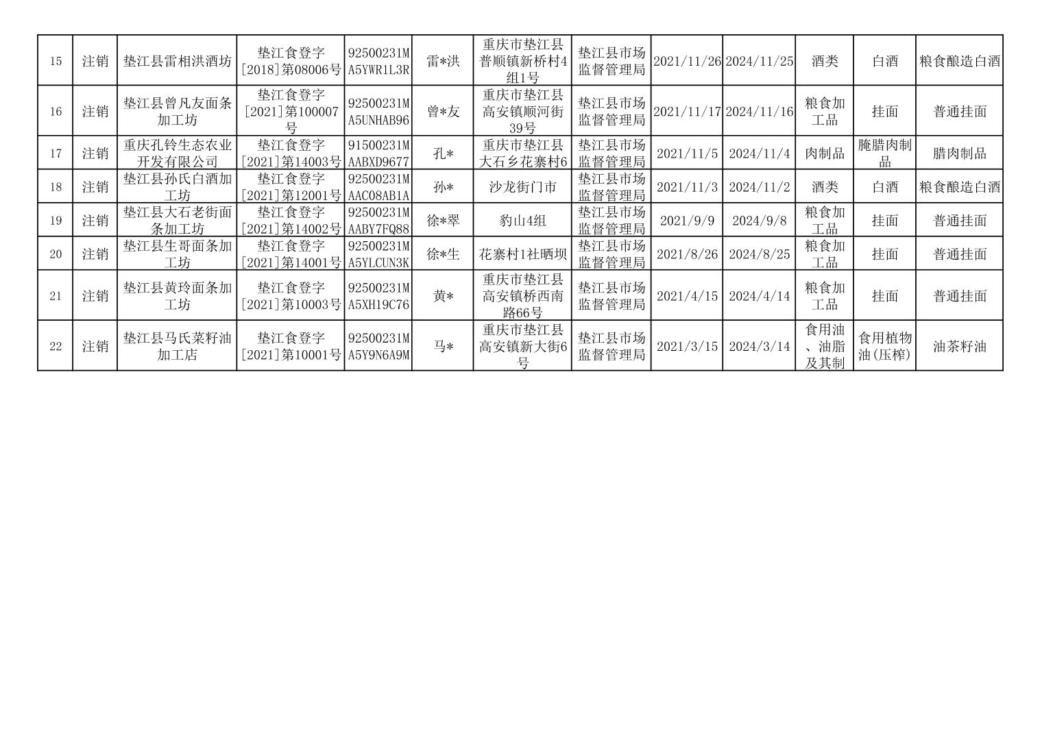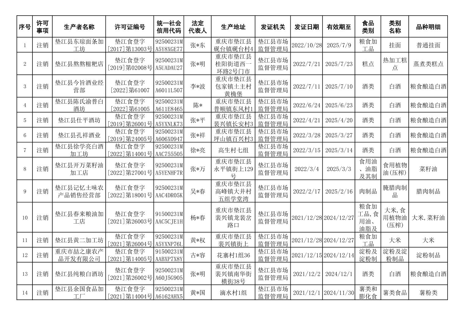 垫江县小作坊登记证注销情况信息台账(2025年8月)