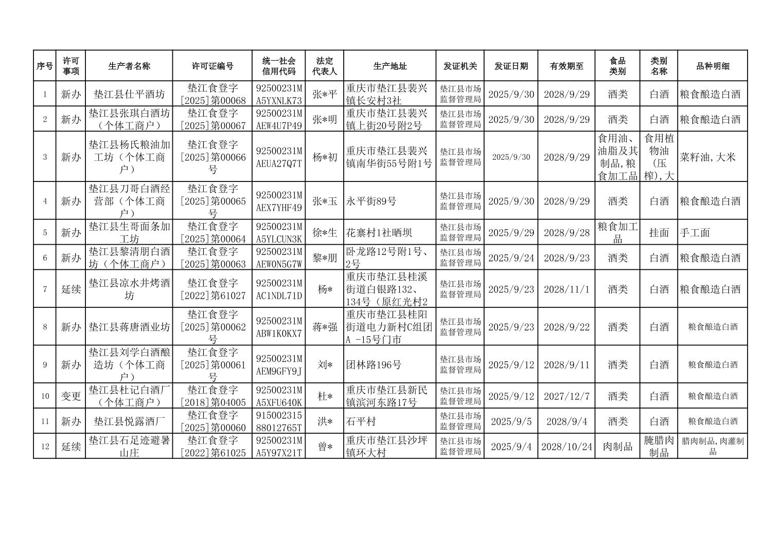 垫江县小作坊登记证登记情况信息台账(2025年9月)