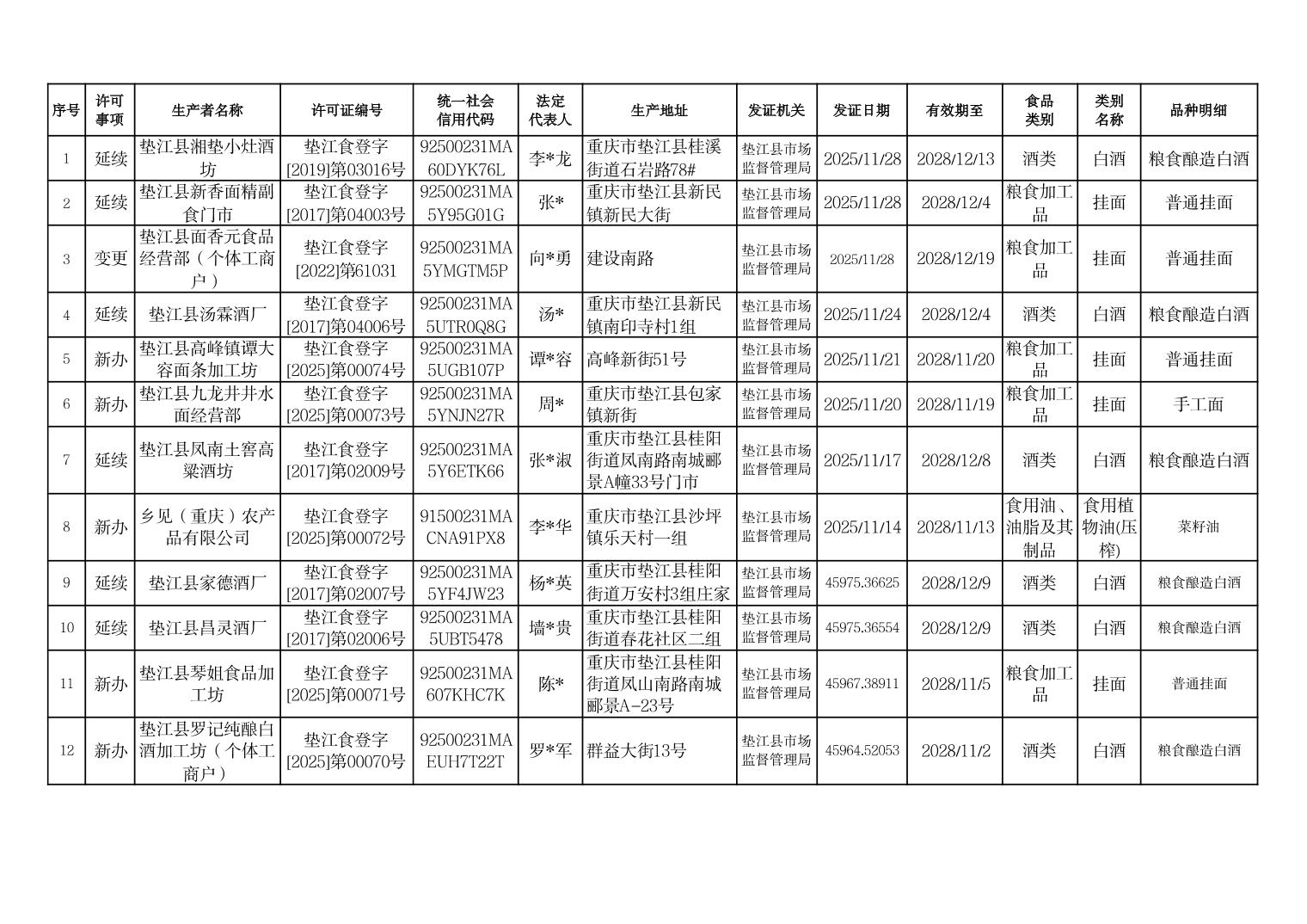 垫江县小作坊登记证登记情况信息台账(2025年11月)