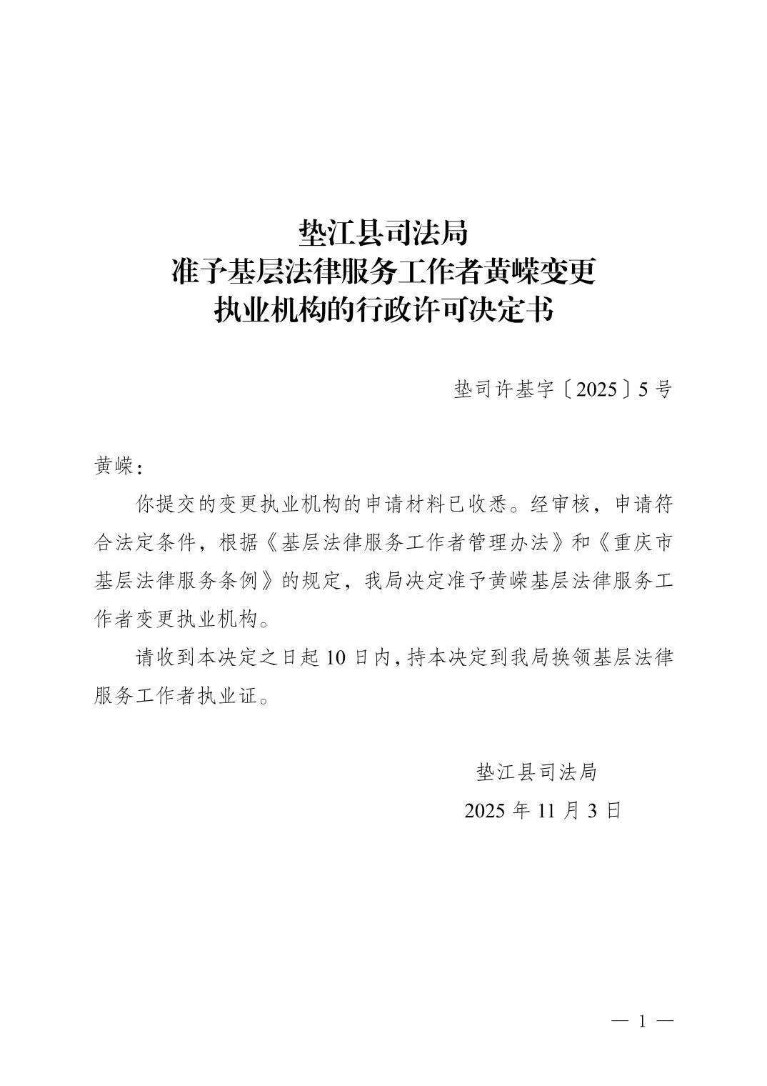 准予基层法律服务工作者黄嵘变更执业机构的行政许可决定书