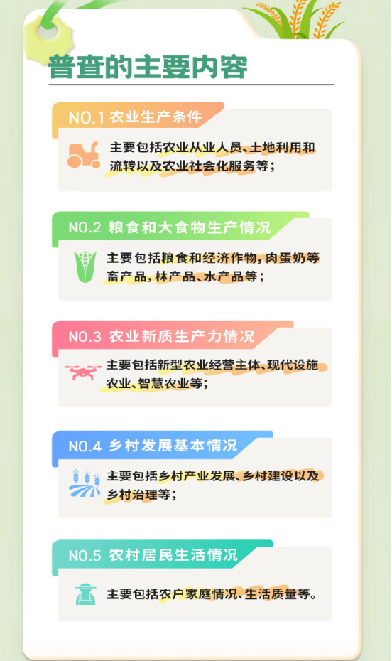 答:普查的主要内容包括:农业生产条件、粮食和大食物生产情况、农业新质生产力情况、乡村发展基本情况、农村居民生活情况等。