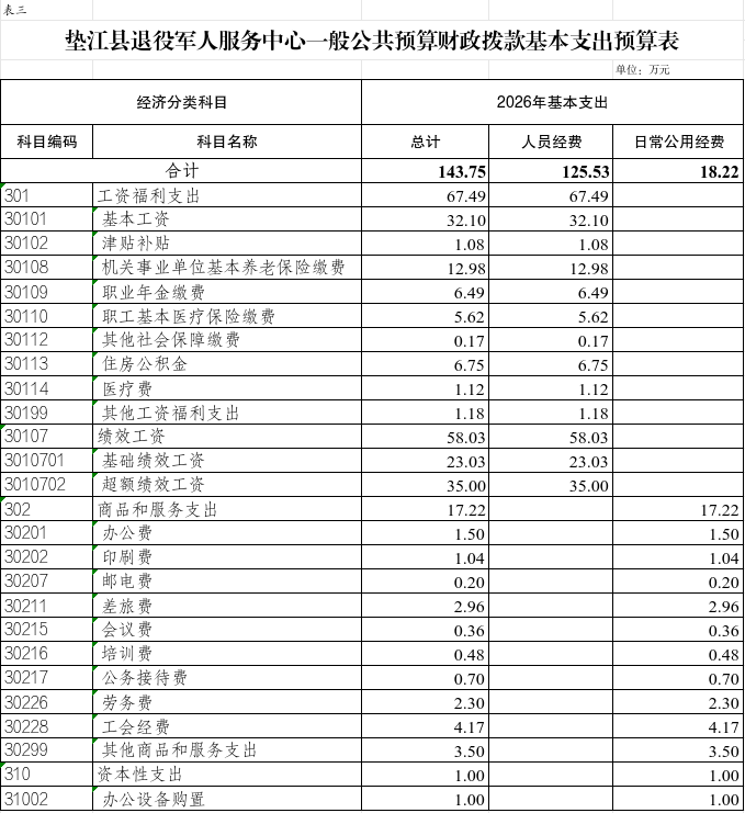 3.垫江县退役军人服务中心一般公共预算财政拨款基本支出预算表