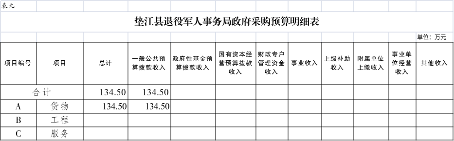 (二)政府采购情况。所属各预算单位政府采购预算总额134.5万元:政府采购货物预算134.5万元、政府采购工程预算0万元、政府采购服务预算0万元;其中一般公共预算拨款政府采购134.5万元:政府采购货物预算134.5万元、政府采购工程预算 0万元、政府采购服务预算0万元。