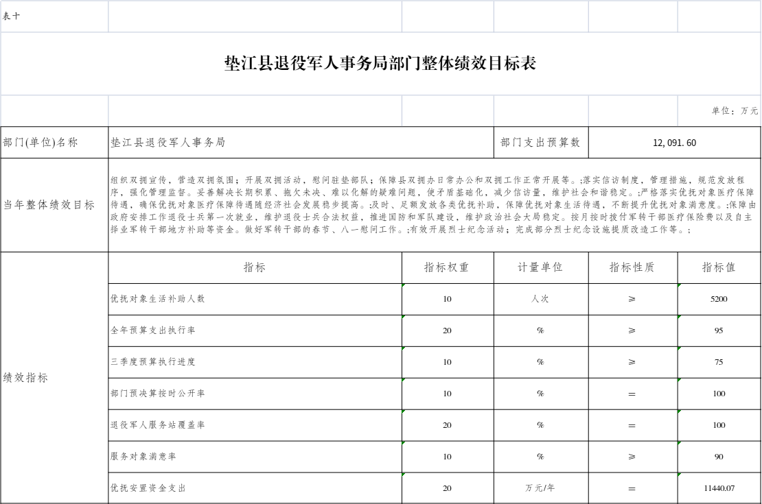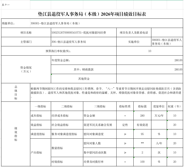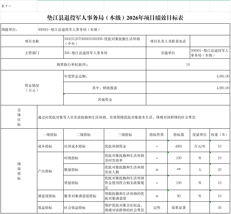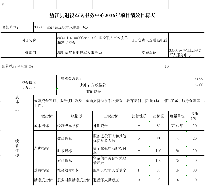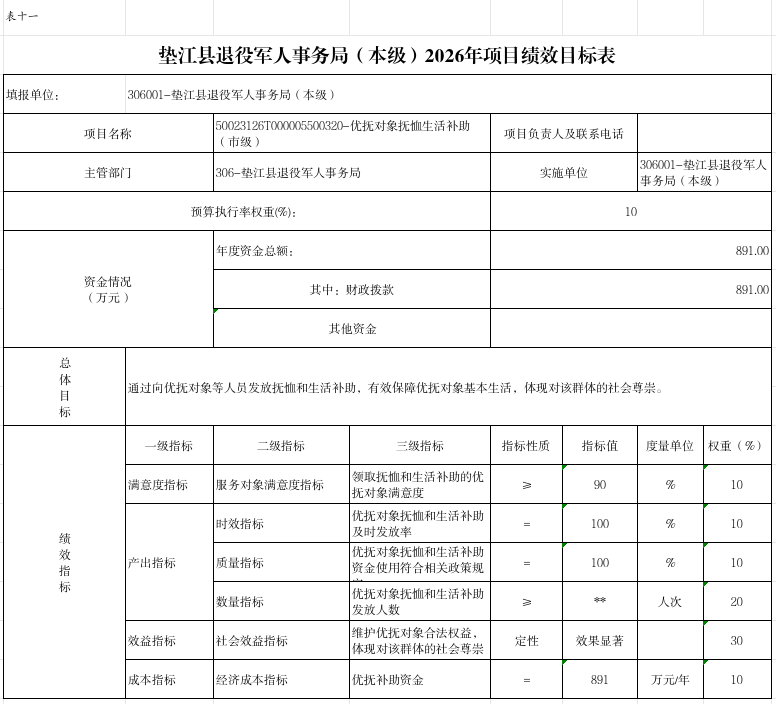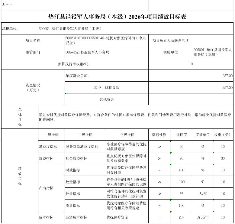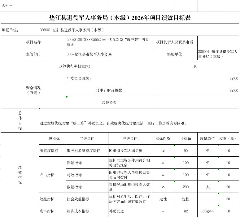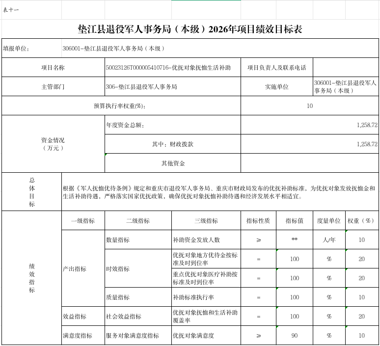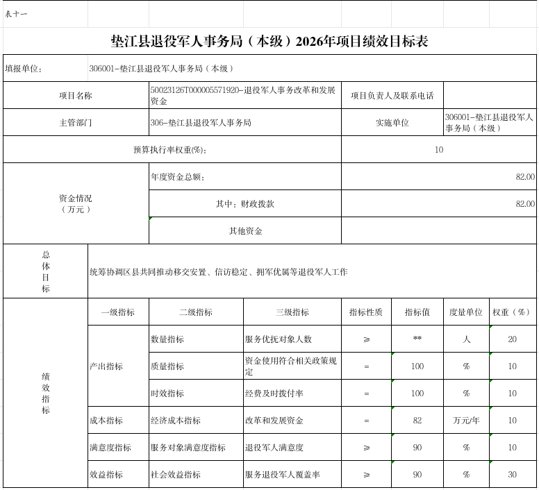 11.垫江县退役军人事务局2026年项目绩效目标表