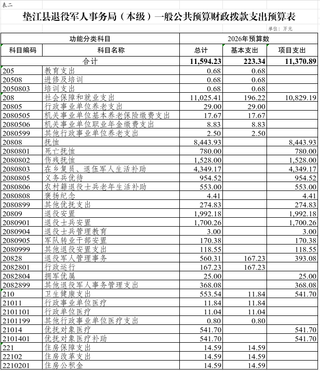 2026年一般公共预算财政拨款收入11594.23万元,一般公共预算财政拨款支出11594.23万元,比2025年减少726.17万元。其中:基本支出223.34万元,比2025年增加21.76万元,主要原因是人员增资及公用经费保障标准提高。主要用于保障在职人员工资福利及社会保险缴费、离休人员离休费、退休人员补助等,保障部门正常运转的各项商品服务支出;项目支出11370.89万元,比2025年减少747.93万元,主要原因是抚恤经费支出减少,卫生健康支出减少。主要用于优抚抚恤、退役安置重点工作。