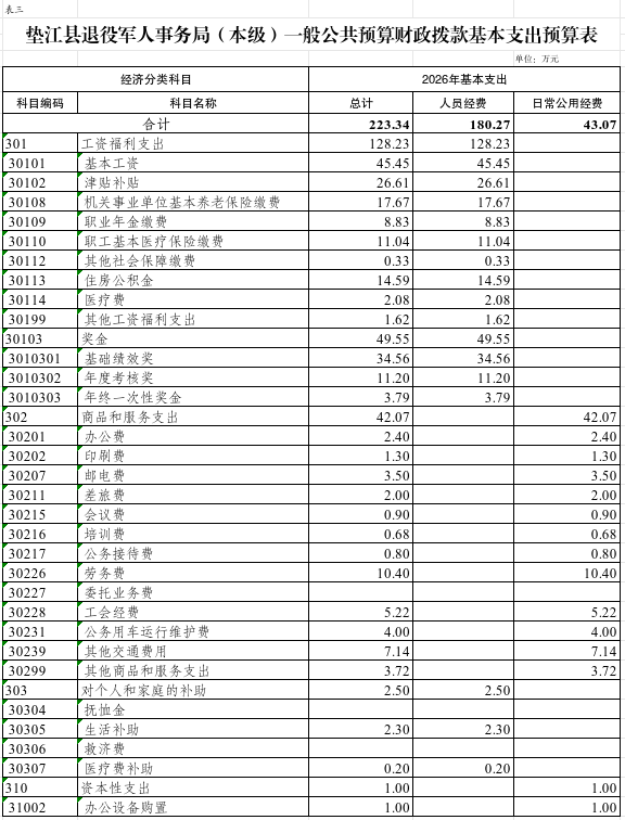 3.垫江县退役军人事务局(本级)一般公共预算财政拨款基本支出预算表