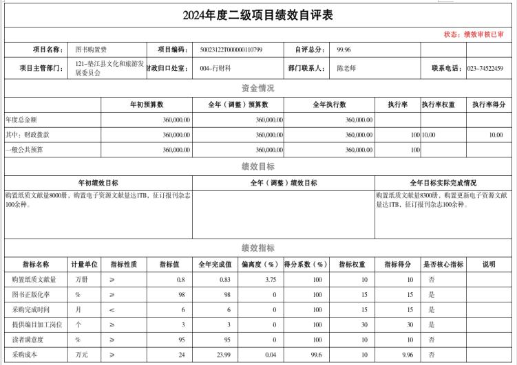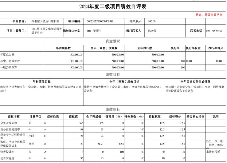 县财政局委托重庆九州恒信建设工程咨询有限公司对垫江县图书馆2024年购买服务人员经费项目进行了绩效评价,涉及财政拨款项目资金93.60万元,评价得分82.00分,评价等次为良,绩效评价发现了“绩效目标明确性不足,指标设置存在瑕疵”、“少量资金使用合规性不足,专项资金使用不规范”、“项目管理制度体系不健全,考核机制流于形式”、“人员配置远超实际需求,排班与薪酬脱钩”等主要问题。提出“完善绩效目标设置,提升绩效指标可操作性”、“加大财政资金监管力度,保障财政资金专款专用”、“建立健全项目管理体系,优化绩效考核机制”、“科学定岗定编,动态调整薪酬体系”等下一步工作建议。