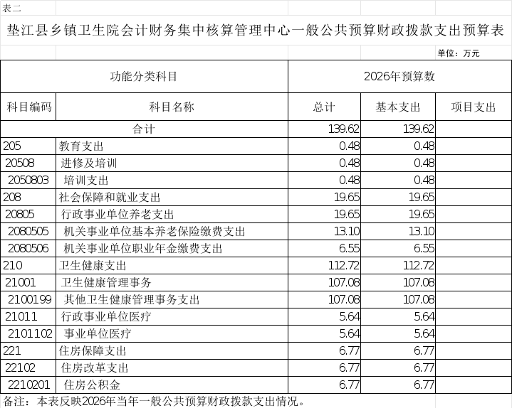 (二)支出预算:2026年年初预算数139.62万元,其中:教育支出0.48万元,社会保障和就业支出19.65万元,卫生健康支出112.72万元,住房保障支出6.77万元;支出较去年增加8.41万元,主要是基本支出增加8.41万元,项目支出增加0万元。