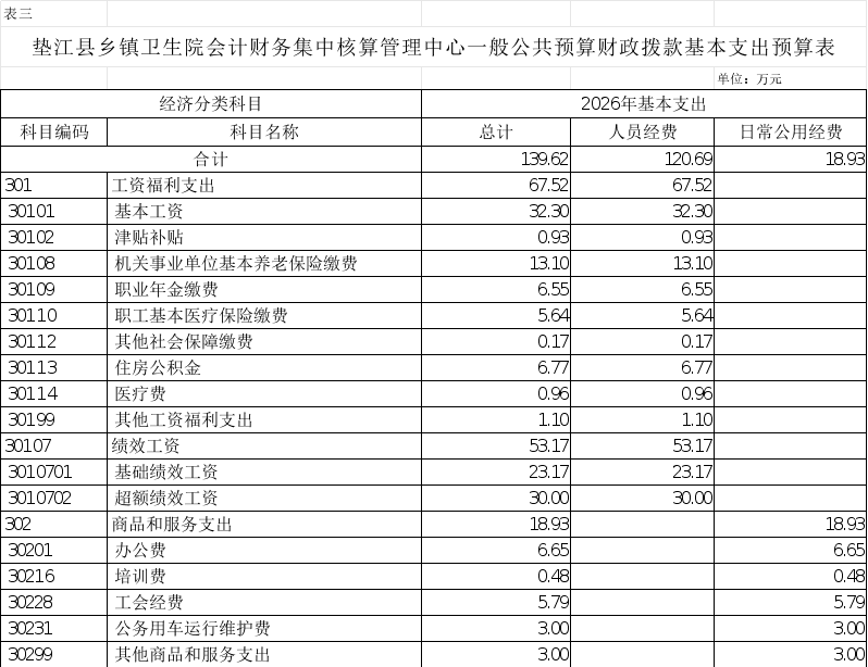 3.垫江县乡镇卫生院会计财务集中核算管理中心一般公共预算财政拨款基本支出预算表