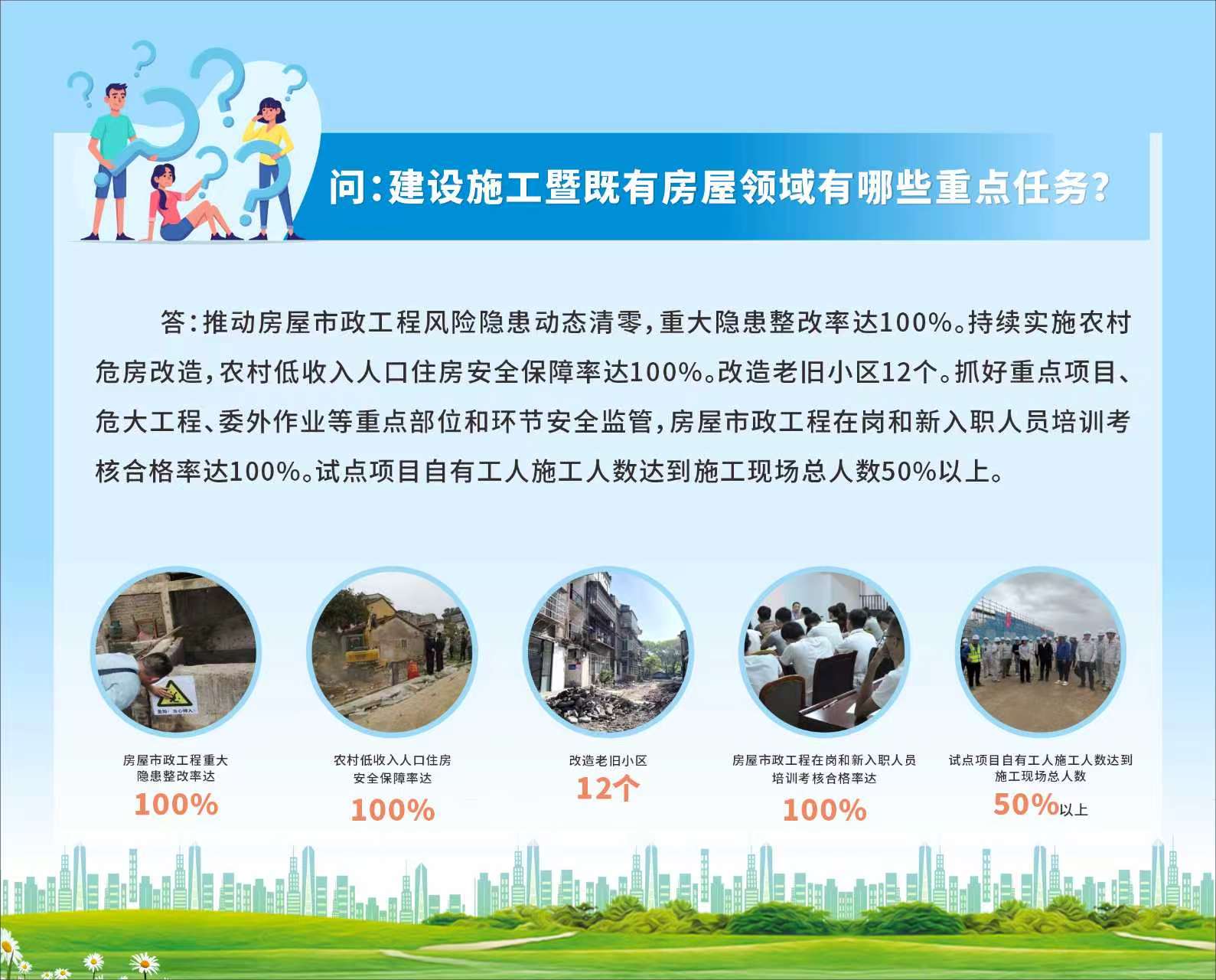 答:推动房屋市政工程风险隐患动态清零,重大隐患整改率达100%。持续实施农村危房改造,农村低收入人口住房安全保障率达100%。改造老旧小区12个。抓好重点项目、危大工程、委外作业等重点部位和环节安全监管,房屋市政工程在岗和新入职人员培训考核合格率达100%。试点项目自有工人施工人数达到施工现场总人数50%以上。