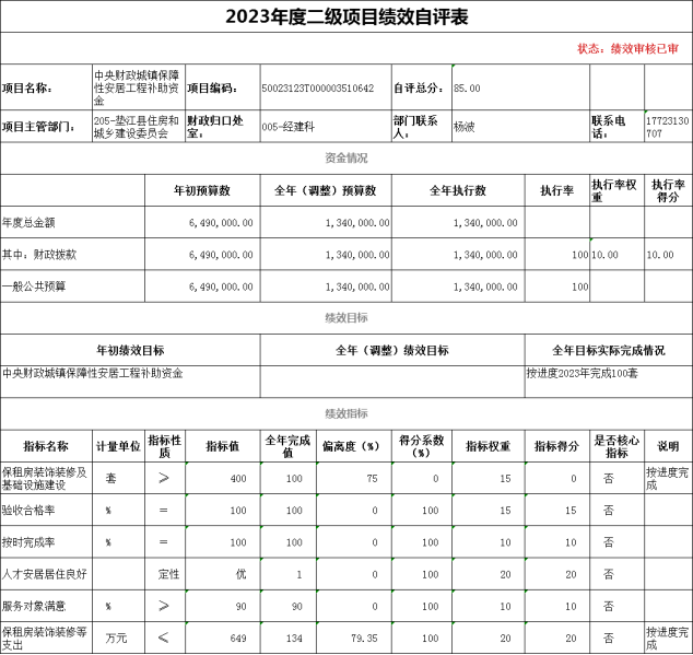 根据预算绩效管理要求,我单位对8个二级项目开展了绩效自评,涉及财政拨款项目支出资金285万元。我单位对中央财政城镇保障性安居工程补助资金开展了绩效评价,涉及财政拨款项目资金134万元,评价得分85分,评价等次为良,绩效评价发现了保租房装饰装修及基础设施建设全年完成值较低等主要问题,提出所有项目的日常管理工作均按照我单位相关管理制度执行,建立工作计划、实施方案、日常监督等管理机制,进一步加大项目进度,力争取得更好的成效等下一步工作建议;