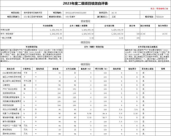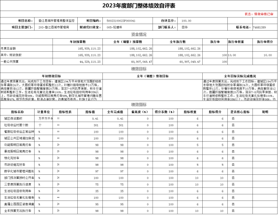 根据预算绩效管理要求,我部门对部门整体和30个二级项目开展了绩效自评,涉及财政拨款项目支出资金15376.78万元。通过年度预算支出,完成如下工作目标:建城区194万平米绿地大范围的枯枝杂草清除24次,大面积草坪绿篱修剪整形12次,补植补栽绿地苗木10万株,病虫害防治12次,苗圃扦插繁植育苗20万株,落实7-8月抗旱保苗、秋冬行道树修剪整形工作。生活垃圾无害化处理率100%,生活垃圾回收利用率35%以上,市政设施完好率98%,功能照明日常亮灯率98%,数字化城市管理问题处置结案率97%.规范市场环境,取消占道经营,改善城市秩序,杜绝十乱行为(乱扔乱牵乱挂乱占乱吐乱停等),对违章占道行为予以制止。