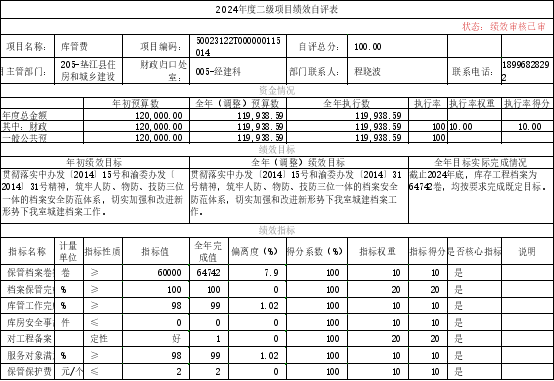 根据预算绩效管理要求,我单位对2个项目开展了绩效自评,涉及财政拨款项目支出资金25.99万元。对库管费项目开展了绩效评价,评价得分90分,评价等次为优,从评价情况来看,我单位项目专项工作均已完成当年计划,保管库存工程档案64742卷,完成了年度绩效目标,切实加强和改进了新形势下我室城建档案工作。