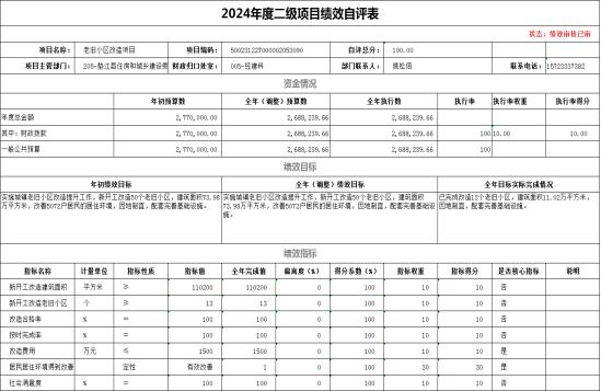 我部门对中央财政城镇保障性安居工程(老旧小区改造)开展了绩效评价,涉及财政拨款项目资金268.82万元,评价得分100分,评价等次为优,从评价情况来看,我委项目专项工作均已完成当年计划,完成了年度绩效目标。所有项目的日常管理工作均按照我委相关管理制度执行,建立了工作有计划、实施有方案、日常有监督的管理机制,工作取得了较好的成效,效能得到了提高。下一步加大项目绩效目标管理,合理提高资金使用效率。