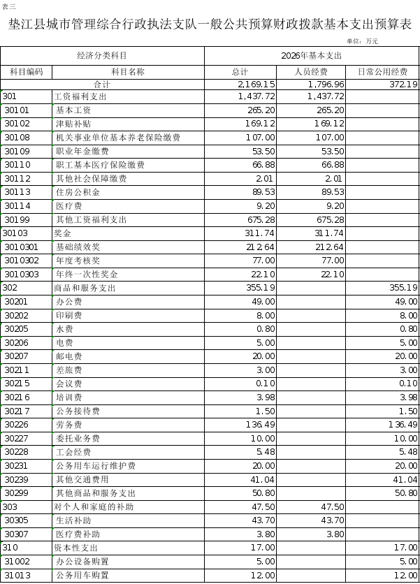 3.垫江县城市管理综合行政执法支队一般公共预算财政拨款基本支出预算表