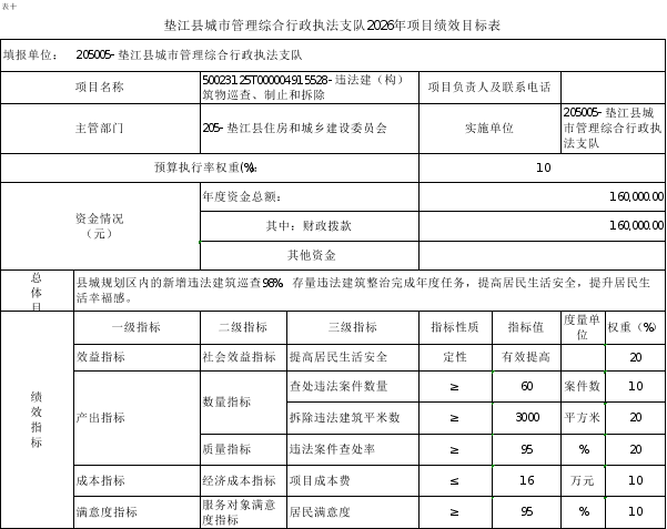 10.垫江县城市管理综合行政执法支队2026年项目绩效目标表
