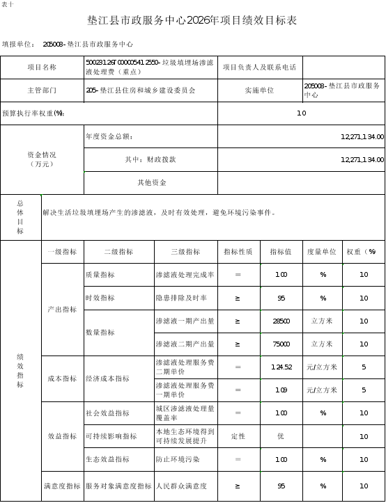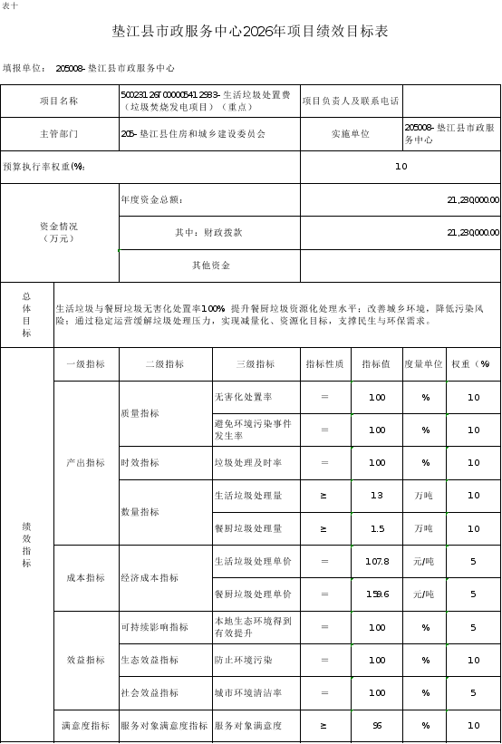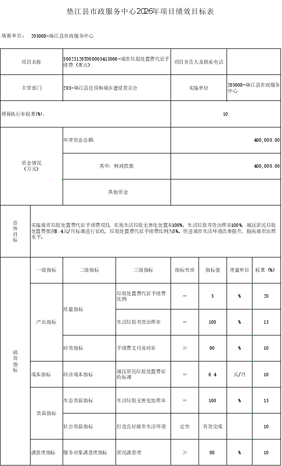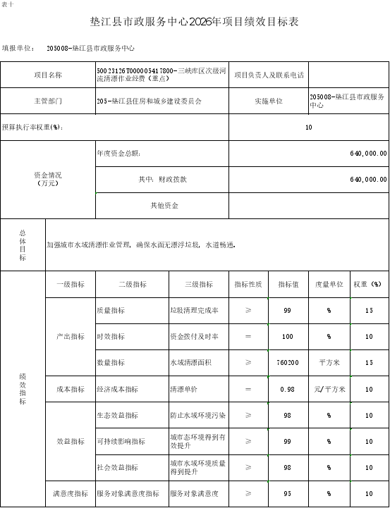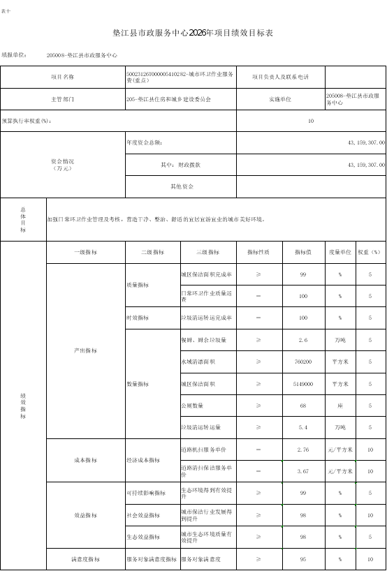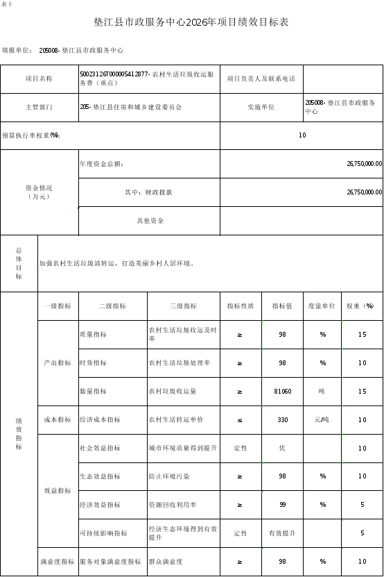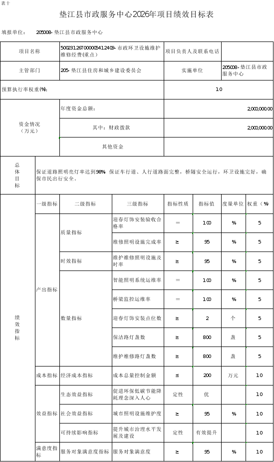 10.垫江县市政服务中心2026年项目绩效目标表