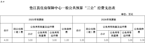 2026年“三公”经费预算3.30万元,比2025年减少0.70万元。其中:因公出国(境)费用0万元,比2025年减少0万元,主要原因是单位按照只减不增的原则,从严控制;公务接待费0.30万元,比2025年减少0.70万元,主要原因是单位按照只减不增的原则,从严控制;公务用车运行维护费3.00万元,比2025年减少0万元,主要原因是单位按照只减不增的原则,从严控制;公务用车购置费0万元,比2025年减少0万元;主要原因是单位按照只减不增的原则,从严控制。
