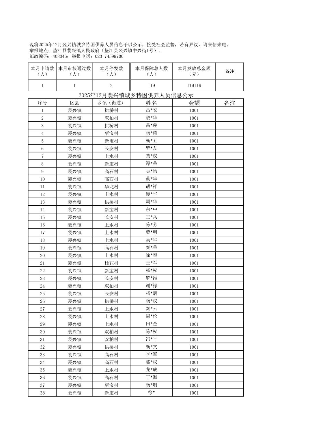 2025年12月裴兴镇城乡特困供养人员信息公示.xls