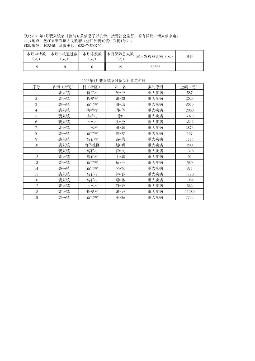 2026年1月裴兴镇临时救助对象花名册