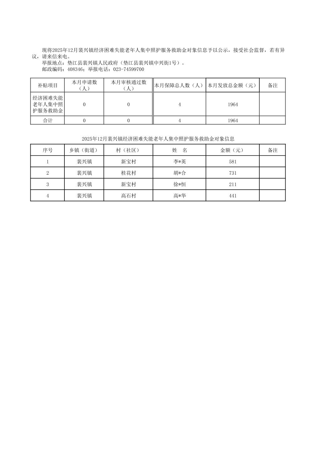 2025年12月裴兴镇经济困难失能老年人集中照护服务救助金对象信息