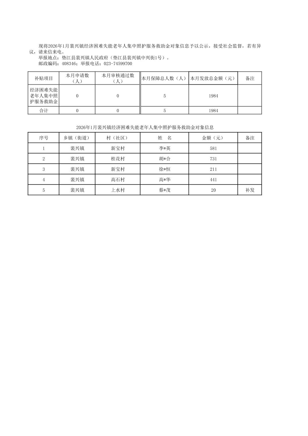 2026年1月裴兴镇经济困难失能老年人集中照护服务救助金对象信息