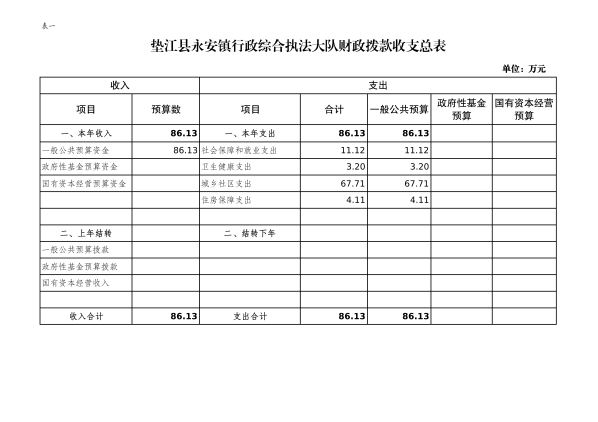 附表:1.垫江县永安镇综合行政执法大队财政拨款收支总表