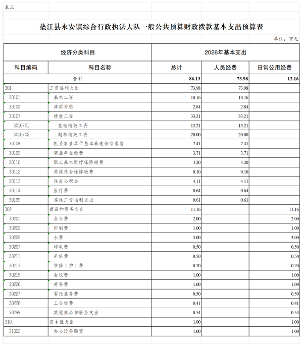 3. 垫江县永安镇综合行政执法大队一般公共预算财政拨款基本支出预算表