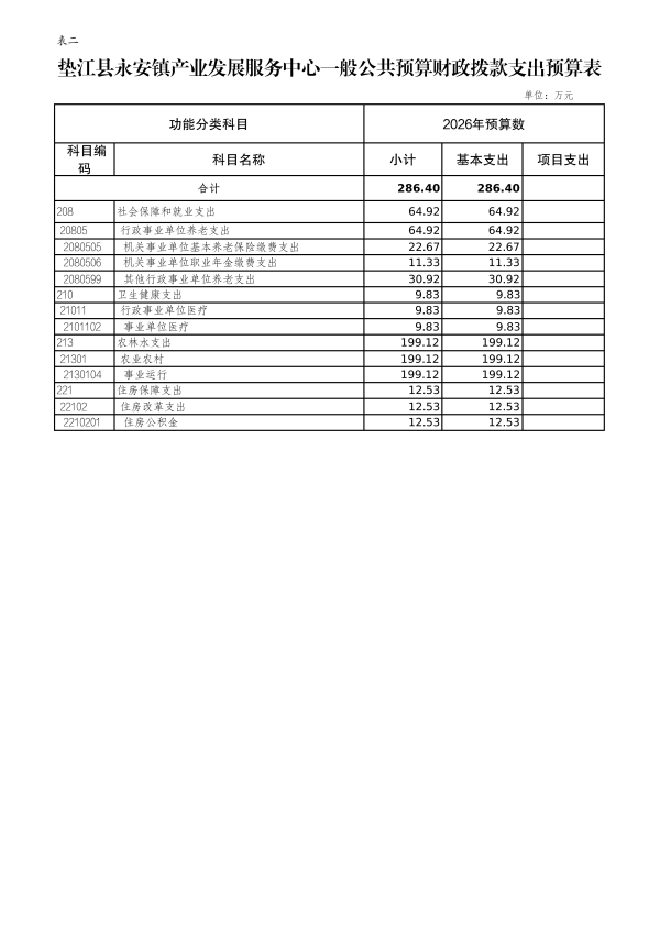 2. 垫江县永安镇产业发展服务中心一般公共预算财政拨款支出预算表