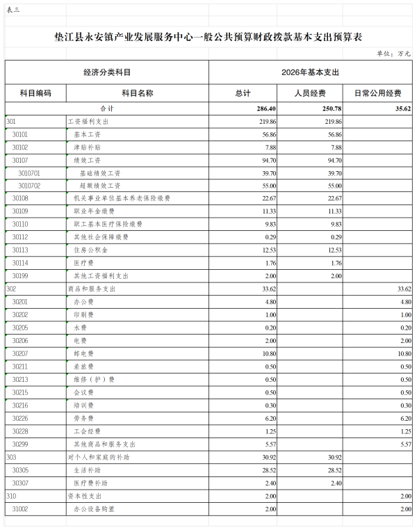 3. 垫江县永安镇产业发展服务中心一般公共预算财政拨款基本支出预算表