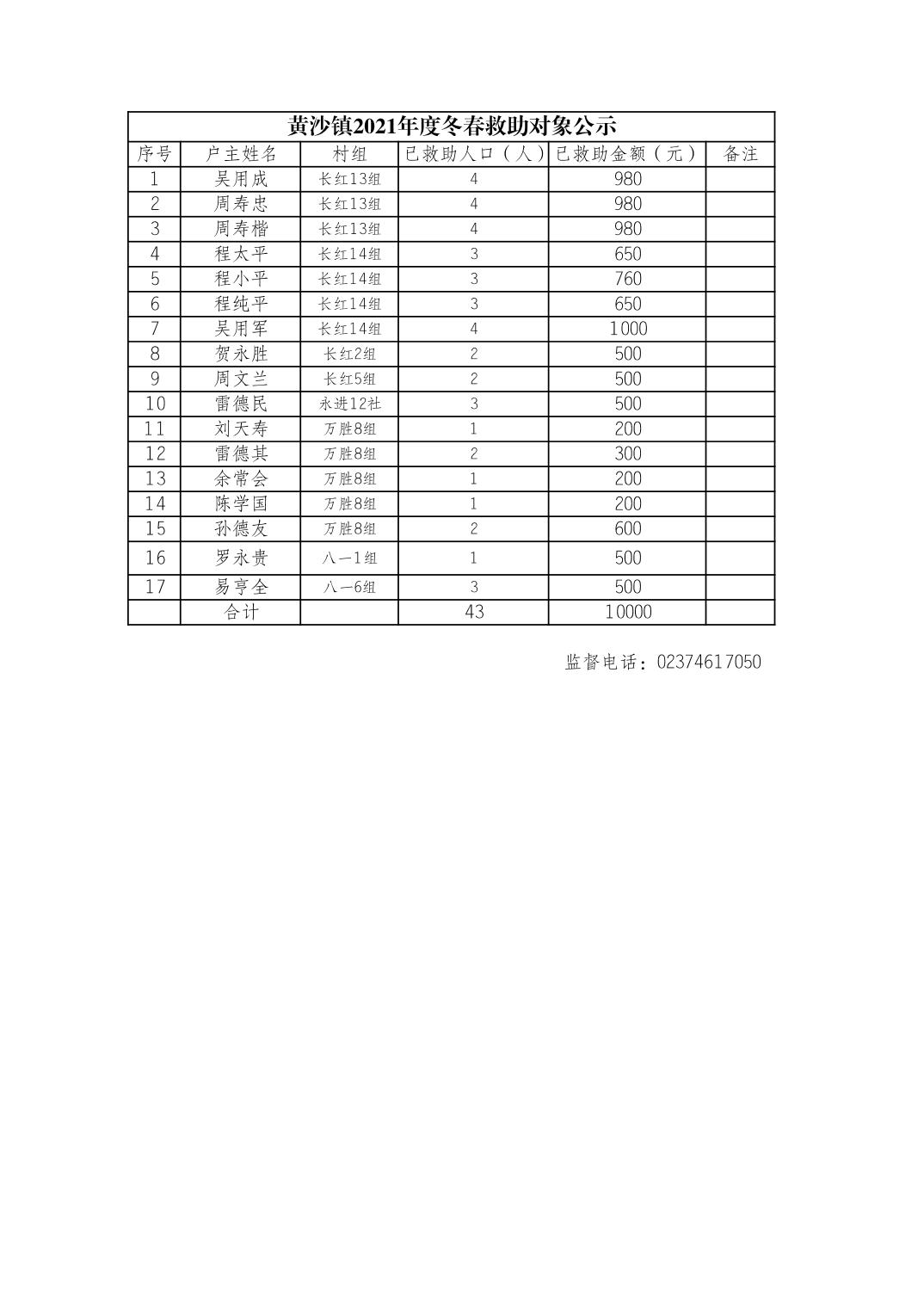 黄沙镇2021度冬春生活救助对象公示