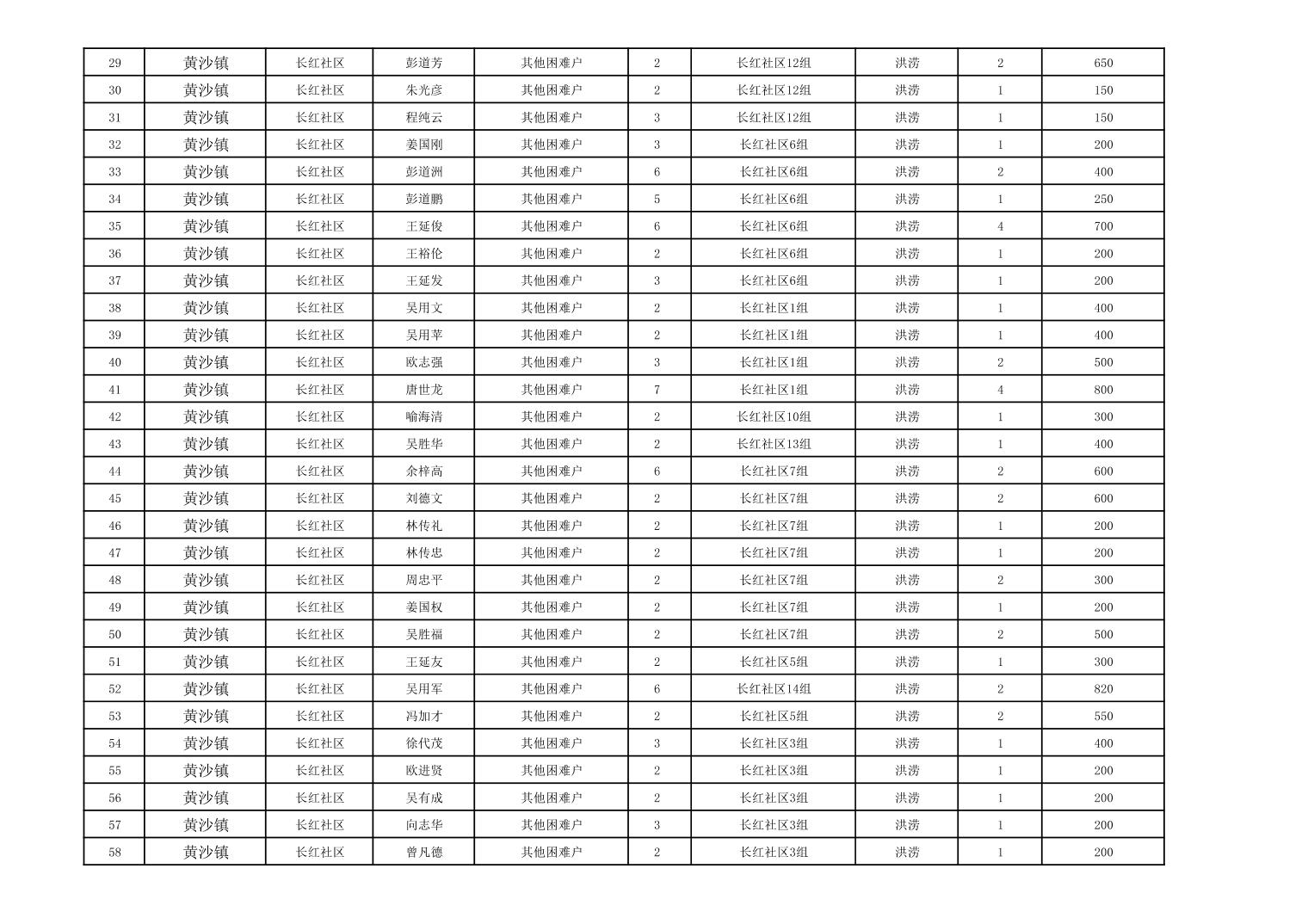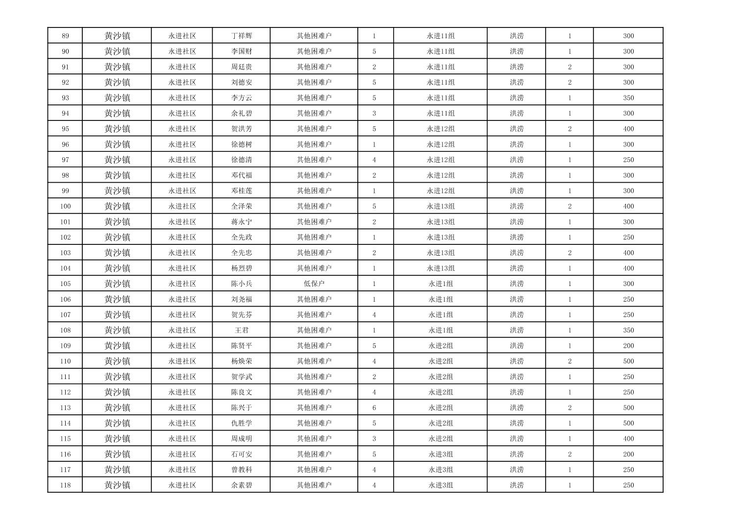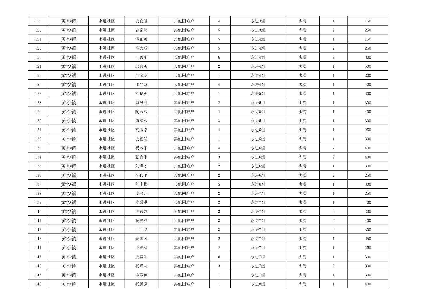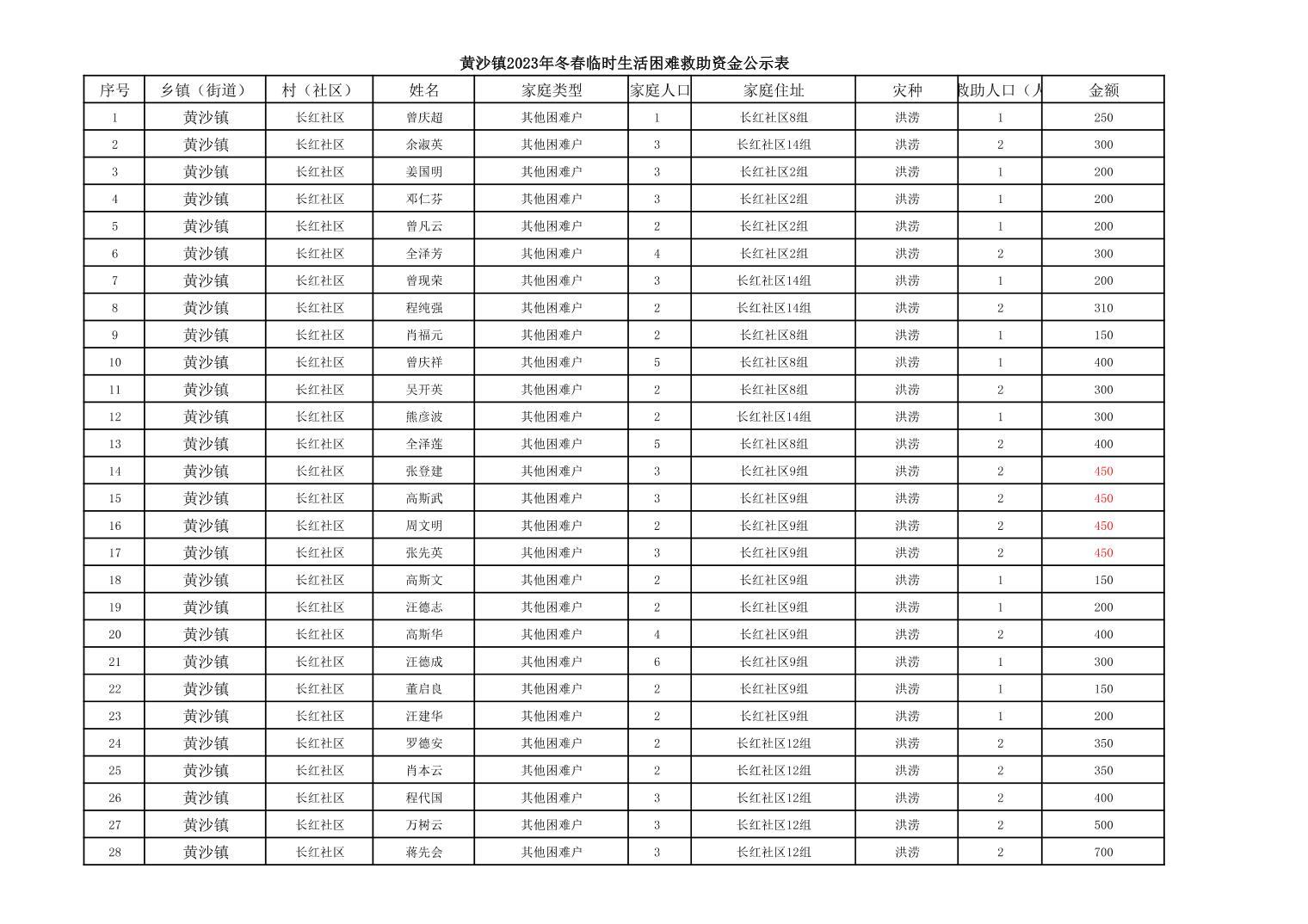 黄沙镇2023年冬春临时生活困难救助资金公示表